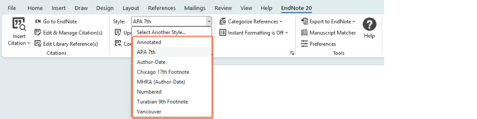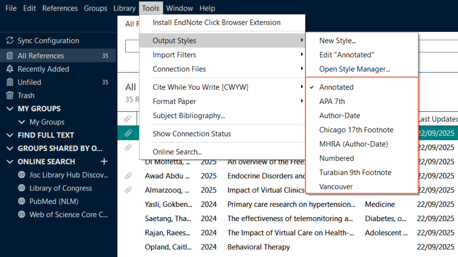 Citations in your document will appear as in-text citations in the body of the writing and also as the reference list or bibliography at the end of the document. The referencing output style is the way citations appear in the document, for example APA, Harvard or Vancouver styles.