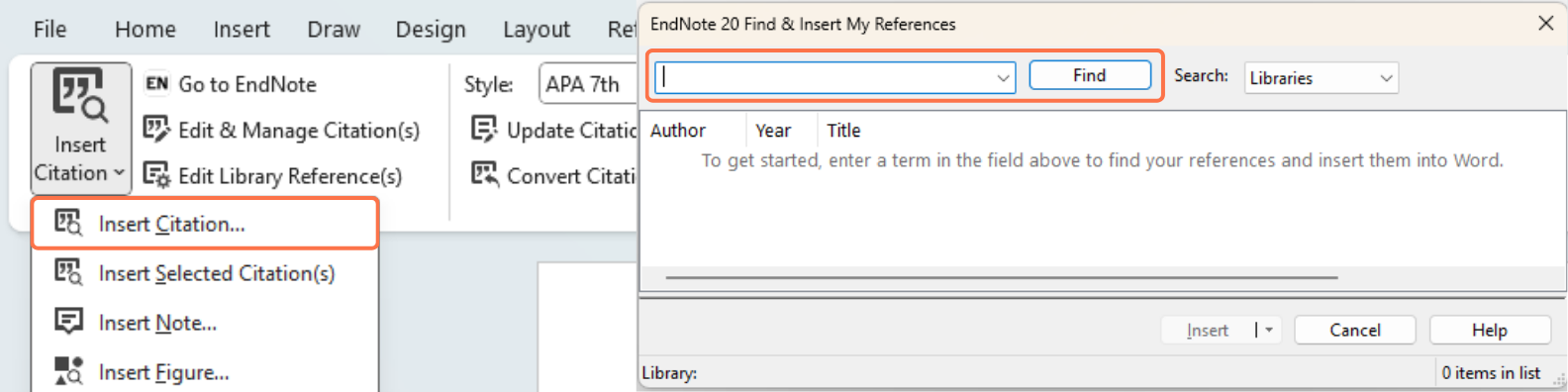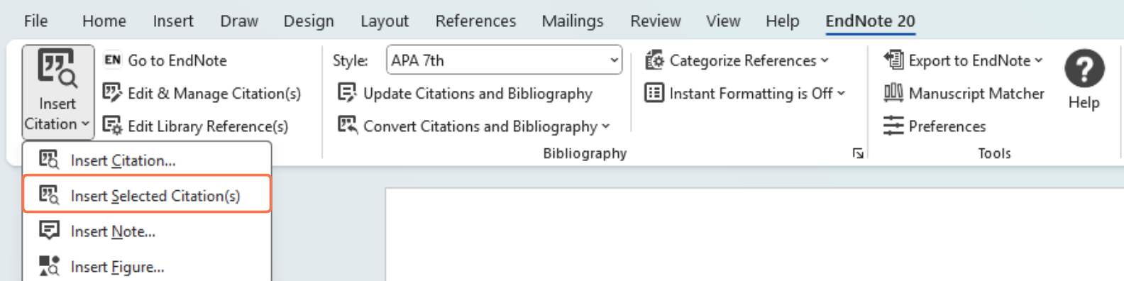 Citations can be inserted into a word document from a linked EndNote library. Citations can be inserted by selecting references within the EndNote library as well as by searching and inserting citations within word.